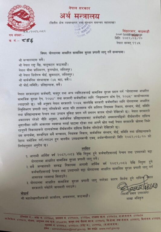 काठमाडौं, २० असार । सरकारले आगामी आर्थिक वर्ष २०८२/०८३ देखि नियुक्त हुने कर्मचारीहरुलाई योगदानमा आधारित सामाजिक सुरक्षा प्रणाली लागू गर्ने भएको छ । यसअघिका कर्मचारीहरुले पेन्सन तथा उपदान पाइरहेको भए पनि अब नियुक्त हुने कर्मचारीहरुको हकमा भने योगदानमा आधारित सामाजिक सुरक्षा प्रणाली लागू हुने भएको हो ।