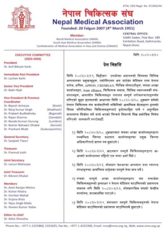 काठमाडौं, २० असार । नेपाल चिकित्सक संघले आन्दोलनका थप कार्यक्रम सार्वजनिक गरेको छ । संघका महासचिव डा. सञ्जिव तिवारीले संघले थप आन्दोलनका कार्यक्रम घोषणा गरेको जानकारी दिए ।
