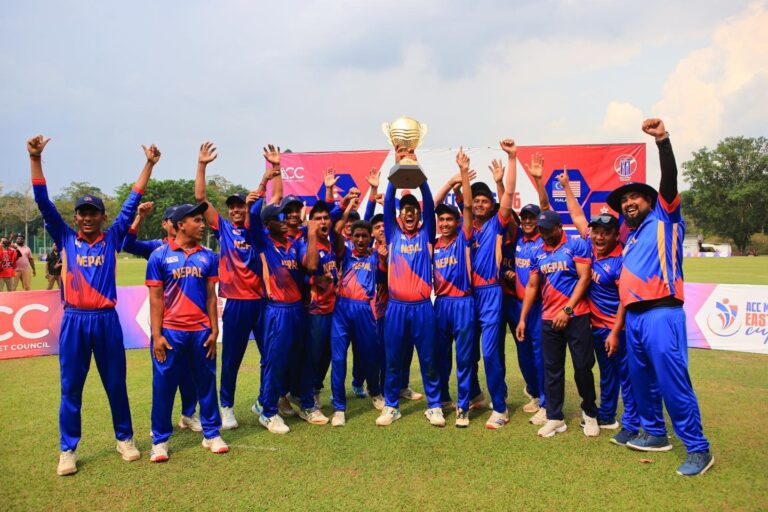 काठमाडौं, २१ असार । मलेसियामा सम्पन्न एसीसी यू–१६ इस्ट जोन कप क्रिकेटको उपाधि नेपालले हात पारेको छ । आज (शनिबार) भएको फाइनल खेलमा नेपालले सिंगापुरलाई २ विकेटले पराजित गरेको हो । सिंगापुरले दिएको ११४ रनको लक्ष्य नेपालले २९ ओभरमा ८ विकेटको क्षतिमा पुरा गरेको हो ।