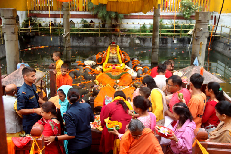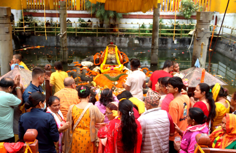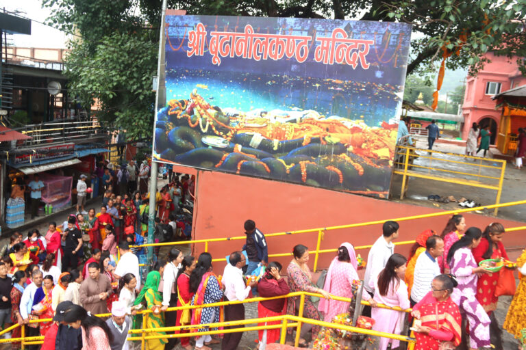 काठमाडौँ,२२ असार। हरिशयनी एकादशी अर्थात तुलसी रोप्ने दिन आज काठमाडौँको बुढानीलकण्ठ मन्दिरमा भगवान् नारायणको पूजा आराधना एवं दर्शन गर्दै श्रद्धालु भक्तजन। तस्बिर:हरिराम भेटुवाल/रासस