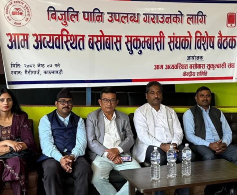 यस्तै सुकुम्बासीहरुसंग विद्युत प्राधिकरणले लिइरहेको विभेदपूर्ण महसुल दरको विरुद्ध सरोकारवालाहरुको ध्यानाकर्षण गराउँदै विरोधको कार्यक्रमहरू अघि बढाउने निर्णय पनि बैठकले गरेको छ । यसका साथै भूमिहिन सुकुम्बासी तथा अव्यवस्थित बसोबासीहरुलाई समयमै जग्गा धनी दर्ता प्रमाण (लाल पूर्जा) उपलब्ध गराउन नेपाल सरकारको ध्यानाकर्षण गराउने निर्णय समेत गरेको छ ।