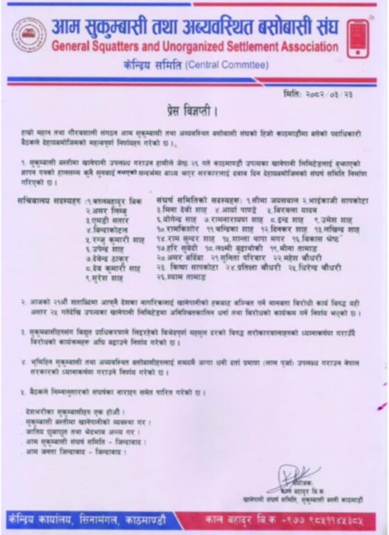 ‘हामी सुकुम्बासीहरु एक होऔं, सुकुम्बासी बस्तीमा खानेपानीको व्यवस्था गर, भूमिहिन सुकुम्बासीहरुलाई लालपूर्जाको व्यवस्था गर, विभेदकारी विद्युत महसुल दर खारेज गर, जातिय छुवाछुत तथा भेदभाव अन्त्य गर, गरिब दलितलाई आवासको व्यवस्था गर, आम सुकुम्बासी संघर्ष समिति – जिन्दावाद, आम जनता जिन्दावाद – जिन्दावाद, आम जनता पार्टी – जिन्दावाद,’ लगायतका नारा बैठकले तय गरेको छ ।