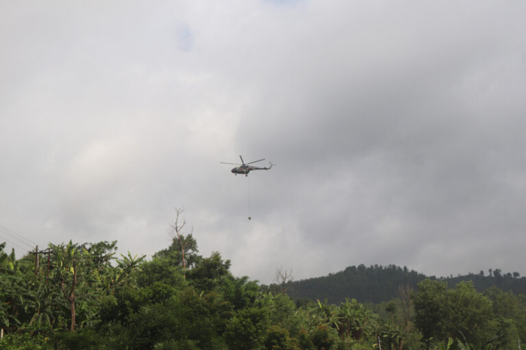 काठ टिप्न जाने क्रममा फसेका स्थानीय ५६ वर्षीय पाल्देन तामाङ र उनको श्रीमती ५१ वर्षीया मङ्गली तामाङको नेपाली सेनाको हेलिकप्टर मार्फत नेपाली सेनाले उद्धार गरेको हो । तस्बिर : रामहरि न्यौपाने / रासस