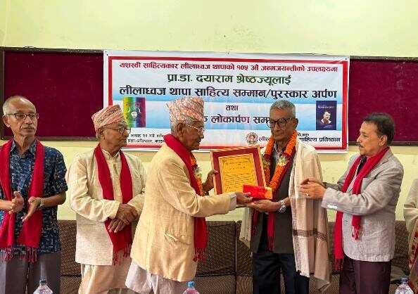 काठमाडौं, २४ असार । प्रा. डा. दयाराम श्रेष्ठलाई लीलाध्वज थापा साहित्य सम्मान/पुरस्कार अर्पण गरिएको छ । गत शनिवार सम्पन्न नेपाल प्रज्ञा प्रतिष्ठानको सभा भवनमा सम्पन्न भएको साहित्यकार लीलाध्वज थापाको १०५ औं जन्मजयन्ती समारोहमा प्रा.डा. दयाराम श्रेष्ठलाई लीलाध्वज थापा साहित्य सम्मान÷पुरस्कार दिइएको हो ।