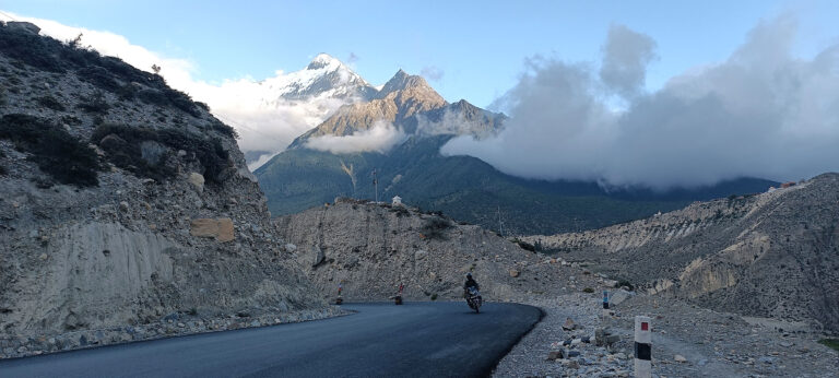 जोमसोम (मुस्ताङ), २५ असार । बेनी-जोमसोम-कोरोला सडक अन्तर्गत मुस्ताङको घरपझोङ गाउँपालिका-३ को सडकखण्डमा हालै गरिएको कालोपत्र र पृष्ठभूमिमा निलगिरि हिमाल । तस्बिर: सुशीलबाबू थकाली/रासस