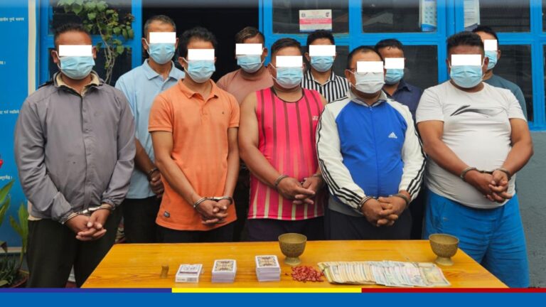 काठमाडौं, २७ असार । काठमाडौं महानगरपालिका १६ गुम्बा चोकबाट जुवा तास खेलिरहेको अवस्थामा १० जुवाडे पक्राउ परेका छन् । उनीहरुलाई प्रहरी वृत्त बालाजुबाट खटिएको प्रहरी टोलीले जुवा तास खेलिरहेको अवस्थामा ५० हजार २ सय ९० नगद सहित पक्राउ गरेको हो ।