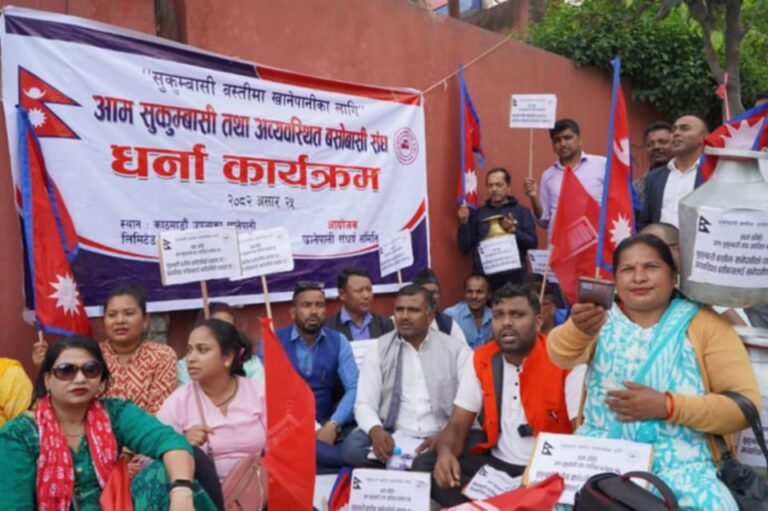 ‘आजको २१औं शताब्दिमा आफ्नै देशका नागरिकलाई खानेपानीको हकबाट वञ्चित गर्ने मानवता विरोधी कार्य विरुद्ध हामी काठमाडौं उपत्यका खानेपानी लिमिटेडमा धर्ना तथा विरोधको कार्यक्रम गर्न बाध्य भएका छौं । हामी हाम्रो मागको बारेमा सरकार र सम्बन्धित निकायलाई पटक पटक ध्यानाकर्षण गराउँदा समेत कुनै सुनुवाई नभएपछि कार्यालय घेराउ गर्नु परेको हो,’ सुकुम्बासी संघका अध्यक्ष विकले भने ।