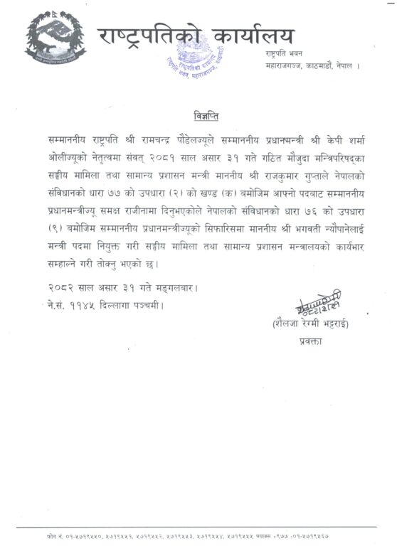 काठमाडौं, ३१ असार । राष्ट्रपति रामचन्द्र पौडेलले प्रधानमन्त्री केपी शर्मा ओलीको सिफारिशमा भगवती न्यौपानेलाई संघीय मामिला तथा सामान्य प्रशासनमन्त्रीमा नियुक्त गरेका छन् ।
