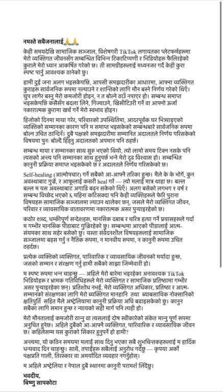 आज एक वक्तव्य जारी गर्दै अहिले आफ्नो विरुद्धमा भइरहेको अनावश्यक टिकटक भिडिओहरु र भ्रामक गतिविधिहरुले आफ्नो व्यक्तिगत र सामाजिक प्रतिष्ठामा गम्भीर असर पुगेको बताएका छन् ।