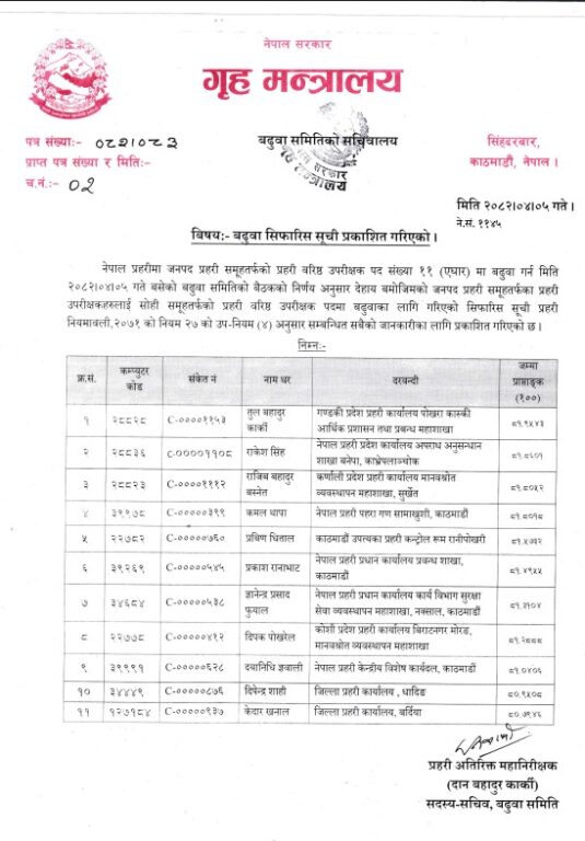 बढुवा समितिका सदस्य सचिव एआईजी दानबहादुर कार्कीका अनुसार एसएसपीमा बढुवा हुनेमा तुलाबहादुर कार्की, राकेश सिंह, राजीवबहादुर बस्नेत, कमल थापा, प्रवीण धिताल, प्रकाश रानाभाट, ज्ञानेन्द्रप्रसाद फुयाल, दीपक पोखरेल, दयानिधि ज्ञवाली, दीपेन्द्र शाही र केदार खनाल रहेका छन् ।