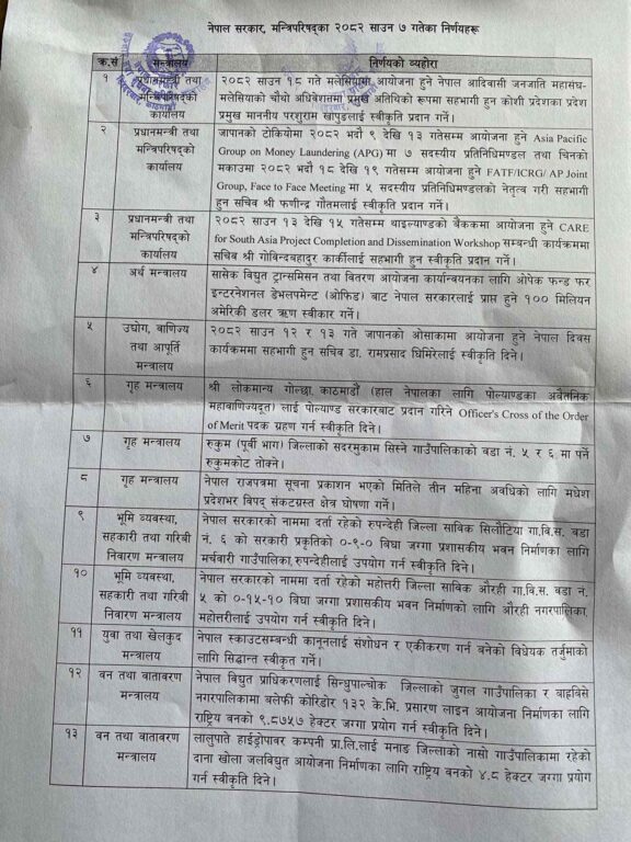 काठमाडौं, ८ साउन । मन्त्रिपरिषद्का निर्णय सार्वजनिक भएको छ । सञ्चार तथा सूचना प्रविधिमन्त्री पृथ्वीसुब्बा गुरुङले साउन ७ गते बसेको मन्त्रिपरिषद्को निर्णय सार्वजनिक गरेका हुन् । मन्त्रिपरिषद् बैठकले कोशी प्रदेश प्रमुख परशुराम खापुङलाई साउन १६ गतेदेखि मलेसियामा आयोजना हुने आदिवासी जनजाती महासंघ मलेसियाको चौथो महाधिवेशनमा प्रमुख अतिथिको रुपमा सहभागी हुन स्वीकृति प्रधान गरेको छ ।