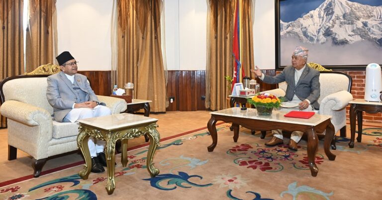 काठमाडौं,९ साउन । प्रतिनिधिसभाका सभामुख देवराज घिमिरेले राष्ट्रपति रामचन्द्र पौडेलसँग भेटवार्ता गरेका छन् । राष्ट्रपति पौडेललाई भेट्न सभामुख घिमिरे जेनेभामा हुने कार्यक्रमको बारेमा जानकारी दिन गएको भनिएपनि संवैधानिक परिषद्सम्बन्धी विद्येयक पुनर्विचारका संसदमै फर्काएपछि चासो राख्दै आज शितलनिवास पुगेको बताईन्छ ।