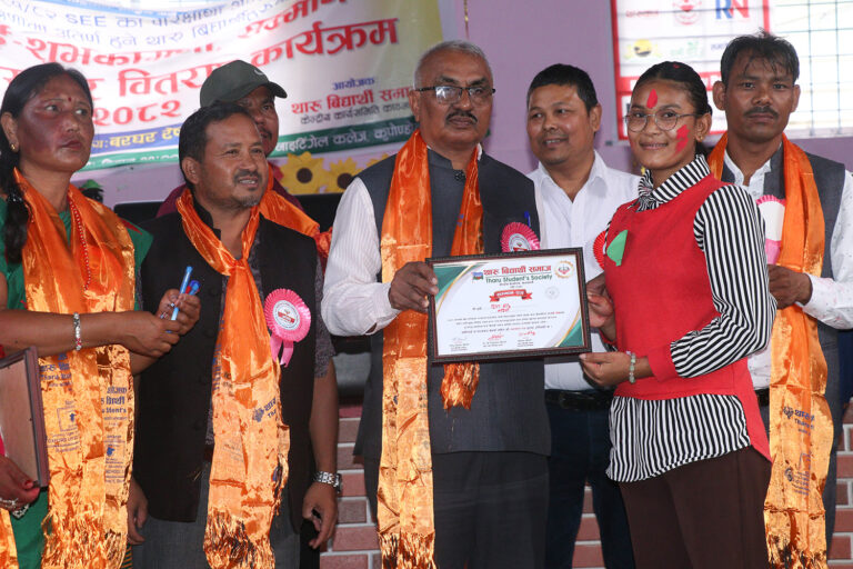 काठमाडौं, ११ साउन । थारू विद्यार्थी समाज केन्द्रिय समितिले एसईईमा उत्कृष्ट नतिजा ल्याउने थारू विद्यार्थीहरूलाई सम्मान गरेको छ । शनिबार ललितपुरको नाईटिंगेल कलेजमा एक कार्यक्रमको आयोजना गरी देशभरका ३।२ जिपिए ल्याउने ८० भन्दा बढी थारू विद्यार्थीहरूलाई सम्मान गरेको हो ।