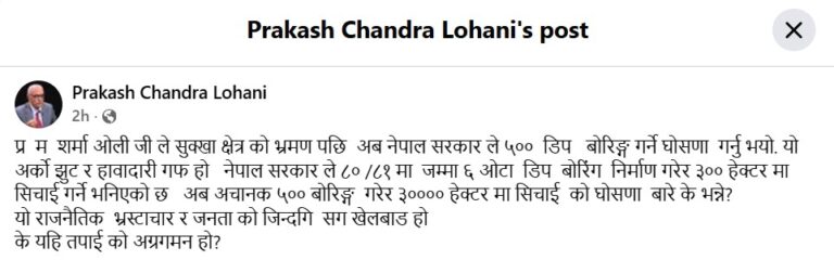 उनले सरकारले २०८०/०८१ को आर्थिक वर्षमा जम्मा ६ वटा डिप बोरिङ निर्माण गरेर तीन सय हेक्टरमा सिंचाई गर्ने भनिएको स्मरण गराउँदै अचानक ५ सय बोरिङ गरेर तीन हजार हेक्टरमा सिंचाईंको घोषणाबारे के भन्ने ? भनेर प्रश्न उठाएका छन् ।