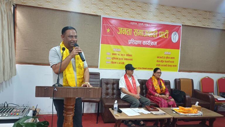 काठमाडौं, १७ साउन । जनता समाजवादी पार्टीका प्रमुख सचेतक तथा पूर्वमन्त्री डा. वीरेन्द्र प्रसाद महतोले राजनीति देश र जनताको लागि सेवा भएको भन्दै सबै नेता तथा कार्यकर्ताहरु यही भावना बोकेर हिँड्नुपर्ने सुझाव दिएका छन् । पार्टीको समाजवादी ट्रेड युनियन महासंघ, नेपाल बौद्धिक पेशाकर्मी महासंघ र संघीय समाजवादी खेलकुद महासंघले आज संयुक्त रूपमा आयोजना प्रशिक्षण कार्यक्रमलाई सम्बोधन गर्दै उनले पार्टीको नीति र विचार लिएर जनताको घरघरमा पुग्नको लागि सबैलाई अपिल गरेका छन् ।