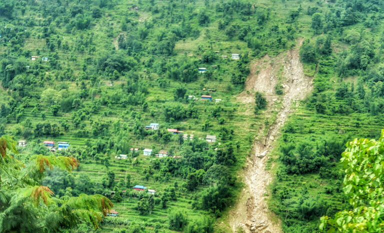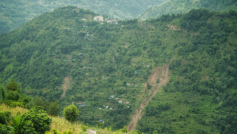 पाँचथर, १८ साउन । पहिरोको जोखिममा रहेको पाँचथरको फालेलुङ गाउँपलिका -३ को लुम्बिङदाङ गाउँ ।
