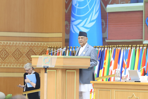 “विकासको खाडललाई कम गर्न क्षेत्रीय एकता र विश्वव्यापी सहयोग महत्त्वपूर्ण हुन्छ भन्ने विश्वास हामीलाई छ । हामी हाम्रा छिमेकी भारत र चीनसँग मिलेर धेरै क्षेत्रहरूमा कनेक्टिभिटी र सहकार्य बढाउन काम मिलेर गरिरहेका छौंँ,”, प्रधानमन्त्री ओलीले भने, “हामी विश्वस्त छौँ कि हाम्रा छिमेकी भारत र चीन तथा व्यापक अन्तरराष्ट्रिय समुदायको निरन्तर समर्थनले, हामी भूपरिवेष्ठितताको अवरोधलाई अवसरको प्रवेशद्वारमा रूपान्तरण गर्न सक्नेछौँ ।”