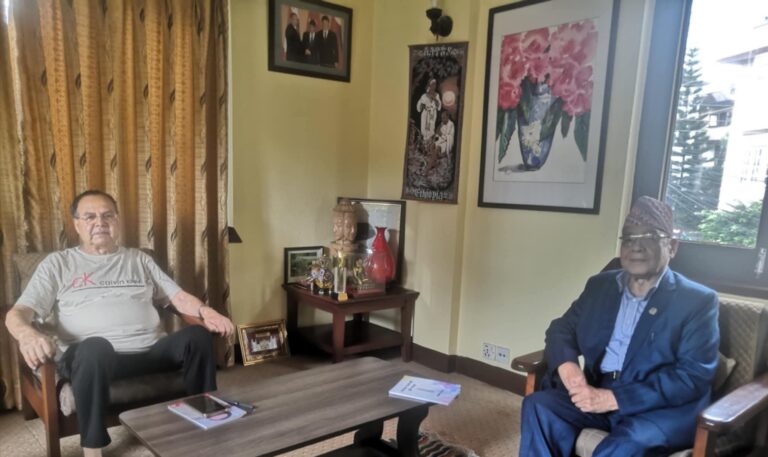 काठमाडौं, २४ साउन । नेकपा (एकीकृत समाजवादी) का सम्मानित नेता झलनाथ खनाल र अर्का नेता वामदेव गौतमबीच भेटवार्ता भएको छ । भेटवार्ताका लागि गौतम आज खनाल निवास डल्लुमा पुगेका हुन् । गौतम नेतृत्वको नेकपा एकता राष्ट्रिय अभियान र एकीकृत समाजवादीबीच गत साउन २ गते एकता भएको थियो । एकतापछि गौतमलाई तेस्रो वरियताको नेता बनाइए पनि उनलाई जिम्मेवारी दिइएको छैन ।