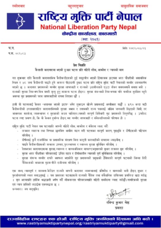 काठमाडौं, २६ साउन । राष्ट्रिय मुक्ति पार्टी नेपालले कैलाली कारागारमा भएको घट्नामा सुरक्षा संयन्त्र असफल भएको निश्कर्ष निकाल्दै गृहमन्त्री रमेश लेखकले राजीनामा दिनुपर्ने माग गरेको छ । पार्टीका प्रवक्ता रविन्द्र कुमार श्रेष्ठले आज एक विज्ञप्ती निकाल्दै गृहमन्त्रीले सो घट्नामा नैतिकताको जिम्मा लिँदै राजीनामा दिनुपर्ने माग गरेका हुन् ।