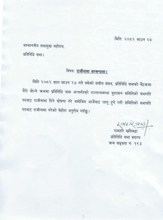 काठमाडौं, २८ साउन । नेपाली कांग्रेसका सांसद रामहरि खतिवडाले सभामुख देवराज घिमिरेलाई भेटेर राज्य व्यवस्था तथा सुशासन समितिको सभापतिबाट राजीनामा दिएका छन् ।