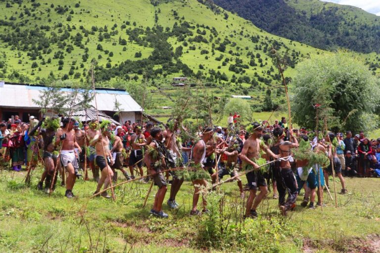 ढोरपाटन (बागलुङ), ४ भदौ । अर्ध नग्न शरीर, मोसोले छोपिएको अनुहार र छाति, कम्मरमा सेतो कपडा बाँधेर हातमा धुपीको हाँगो समातेर केही युवा दौडिँदै थिए । ती युवाका पछि ढ्याङ्ग्रो ठट्याउँदै आइरहेका थिए, झाँक्रीहरु । माथिदेखि दौडिँदै आएको झाँक्री र एक हुल युवाको दृश्य अनौठो थियो । यो अवसरको साक्षी बन्न निसेलढोरमा सयौँ मानिस जम्मा भएका थिए ।