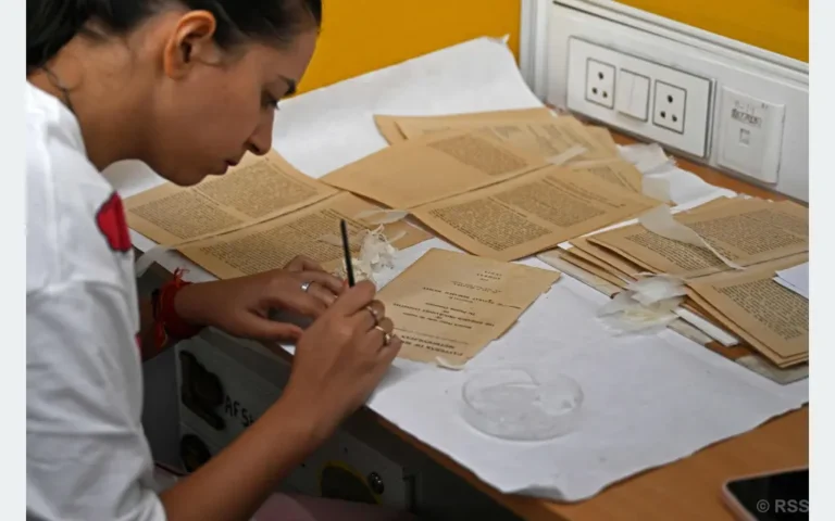 नयाँदिल्ली, ५ भदौ । भारतको राजधानीस्थित जलवायु–नियन्त्रित कोठामा पुनःस्थापनाकर्ताहरूले नयाँदिल्लीको अतीतलाई बुझ्न अनमोल झ्याल प्रदान गर्ने दुर्लभ ऐतिहासिक कागजात र कलाकृतिहरू सावधानीपूर्वक मिलाउँदै छन् ।