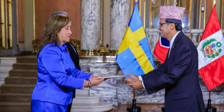 काठमाडौँ, ६ भदौ । ब्राजिलका लागि नेपालका राजदूत निर्मलराज काफ्लेले आज पेरुका राष्ट्रपति दिना एर्सिलिया बोलुआर्टे जेगारासमक्ष नेपालका गैरआवासीय राजदूतका रूपमा आफ्नो ओहोदाको प्रमाणपत्र प्रस्तुत गरेका छन् ।