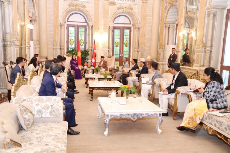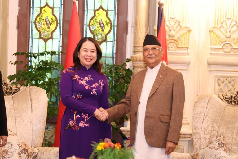 काठमाडौँ, ८ भदौ । प्रधानमन्त्री केपी शर्मा ओली र नेपाल भ्रमणमा रहेकी समाजवादी गणतन्त्र भियतनामका उपराष्ट्रपति भो थि आन सुआनबीच भेटवार्ता भएको छ । आज सिंहदरबारस्थित प्रधानमन्त्री तथा मन्त्रिपरिषद्को कार्यालयमा भेट भएको हो ।