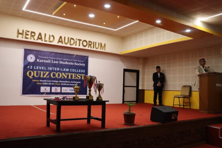 काठमाडौँ । काठमाडौँको बसुन्धरास्थित हेराल्ड ल स्कुलमा शनिबार कर्णाली कानुन विद्यार्थी समाजको आयोजनामा “+2 स्तर अन्तर कलेज स्तरीय कानुन क्विज प्रतियोगिता” भव्य रूपमा सम्पन्न भएको छ।