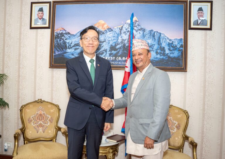 काठमाडौं । ऊर्जा, जलस्रोत तथा सिंचाईमन्त्री दिपक खड्का र नेपालकालागि दक्षिण कोरियाली राजदूत पार्क ताइ योङबीच शिष्टाचार भेट भएको छ । भेटका क्रममा द्विपक्षीय सहकार्यका विषयमा चर्चा भएको मन्त्री खड्काको सचिवालयले जनाएको छ ।