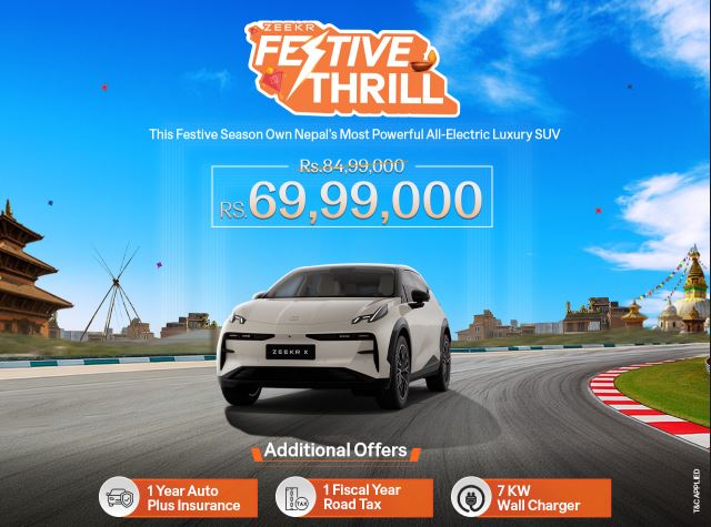 काठमाडौँ, १५ साउन । नेपालका लागि जिकरको आधिकारिक वितरक पायोनियर मोटोकर्पले विशेष चाडपर्वको अवसरमा ‘जिकर फेस्टिभ थ्रिल’ अभियान सार्वजनिक गरेको छ । यो अभियान जिकर एक्सका लागि लागू हुने छ ।दशैं, तिहार र छठको चाडपर्वलाई लक्षित गर्दै जिकर एक्समा विशेष अफर सार्वजनिक गरिएको छ। यो चाडपर्व अफर अन्तर्गत अब ग्राहकहरूले ८४.९९ लाख मूल्य रहेको जिकर एक्स गाडी मात्र ६९.९९ लाखमा खरिद गर्न सक्नेछन्। यस अफरसँगै ग्राहकहरूले ८ वर्ष वा १,६०,००० किलोमिटरको वारेन्टी, १ वर्षको अटो प्लस इन्स्योरेन्स, १ वर्षको सडक कर, र ७ किलोवाट वाल चार्जर समावेश रहेको थप सुविधाहरू पनि प्राप्त गर्नेछन्। जिकर एक्समा २०० किलोवाट मोटर पावर, लेभल २ एडीएएस (ADAS) प्रणाली, १९१ मिलिमिटर ग्राउन्ड क्लियरेन्स, ७ वटा एयरब्याग छन्, र यो गाडीले Euro NCAP, China NCAP र Global NCAP मा ५-स्टार सेफ्टी रेटिङ पाएको छ।