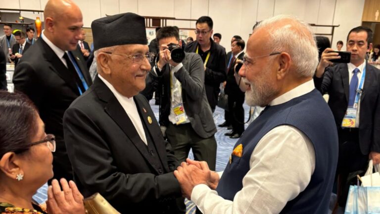 प्रधानमन्त्री ओली र भारतीय प्रधानमन्त्री मोदीबीच तियान्जिनमा ‘स्ट्याण्ड–अप मिटिङ’