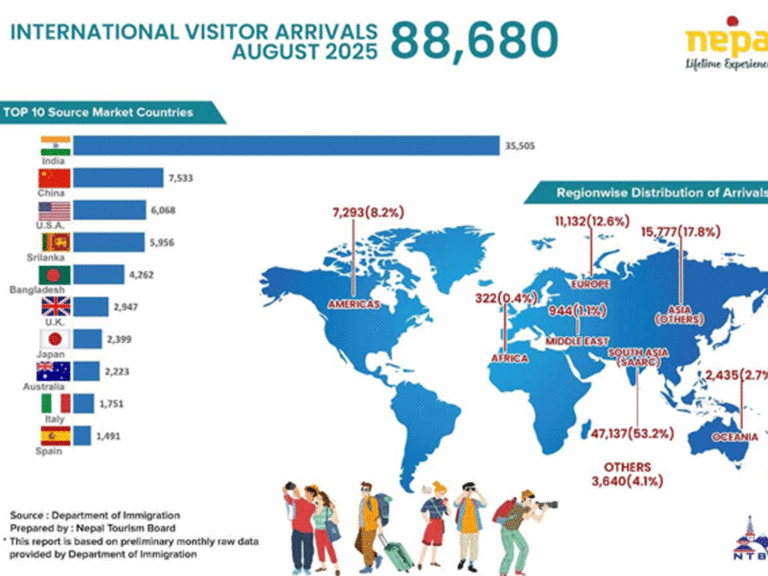 काठमाडौँ, १६ भदौ । सन् २०२५ को अगष्टमा ८८ हजार ६८० पर्यटक नेपाल भित्रिएका छन् । नेपाल पर्यटन बोर्डले आज सार्वजनिक गरेको तथ्याङ्कअनुसार गत वर्षको तुलनामा यस वर्षको अगस्तमा २२ प्रतिशत विन्दुले पर्यटक आगमनमा वृद्धि भएको देखिएको छ ।