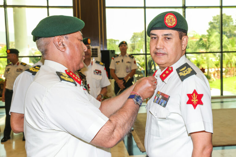 काठमाडौँ, १८ भदौ । प्रधानसेनापति अशोकराज सिग्देलले उपरथीमा बढुवा भएका भोलानाथ थापालाई पदोन्नति भएको दर्ज्यानी चिह्न प्रदान गरेका छन् ।