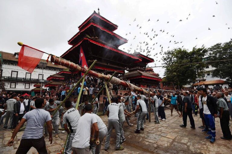 काठमाडौँ, १९ भदौ । विश्व सम्पदा सूचीमा सूचीकृत हनुमानढोका दरबार क्षेत्रस्थित कालभैरवको मूर्तिअघि ईन्द्रजात्राको लिङ्गो उठाइएको अर्थात् इन्द्रध्वजोत्थान गरिएको छ ।