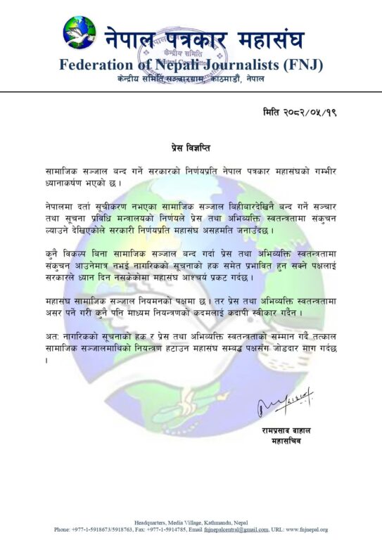 काठमाडौं, १९ भदौ । नेपाल पत्रकार महासंघले सामाजिक सञ्जाल बन्द गर्ने सरकारको निर्णयप्रति गम्भीर ध्यानाकार्षण भएको जनाएको छ। महासंघको तर्फबाट महासचिव रामप्रसाद दाहालले आज प्रेस विज्ञप्ती जारी गर्दै नेपाल दर्ता सूचीकरण नभएका सामाजिक सञ्जाल बिहीबारदेखि नै बन्द गर्ने सञ्चार तथा सूचना प्रविधि मन्त्रालयको निर्णयले प्रेस तथा अभिव्यक्ति स्वतन्त्रतामा संकुचन ल्याउने देखिएकोले सरकारी निर्णयप्रति महासंघले असहमति जनाएको उल्लेख गरिएको छ ।