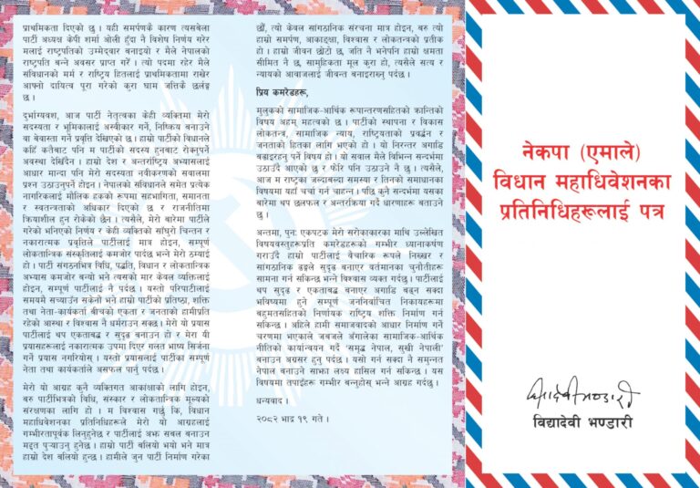 काठमाडौं, २० भदौ । नेकपा (एमाले) को सक्रिय राजनीतिमा फर्किएको घोषणा गरेकी विद्यादेवी भण्डारीले एमालेको आजबाट सुरु भएको विधान महाधिवेशनलाई लक्षित गरेर प्रतिनिधिहरुलाई पत्र लेखेकी छिन् । उनले नेकपा (एमाले) केन्द्रीय कमिटीको यही २०८२ साल श्रावण ५ र ६ गते बसेको बैठकको निर्णयको नाममा नवीकृत भैसकेको आफ्नो सदस्यतामाथि प्रश्न उठाइएकाले यस बारेमा केही कुरा राख्ने उद्देश्यले महाधिवेशन प्रतिनिधिहरुलाई पत्र लेखेको स्पष्ट पारेकी छिन् ।