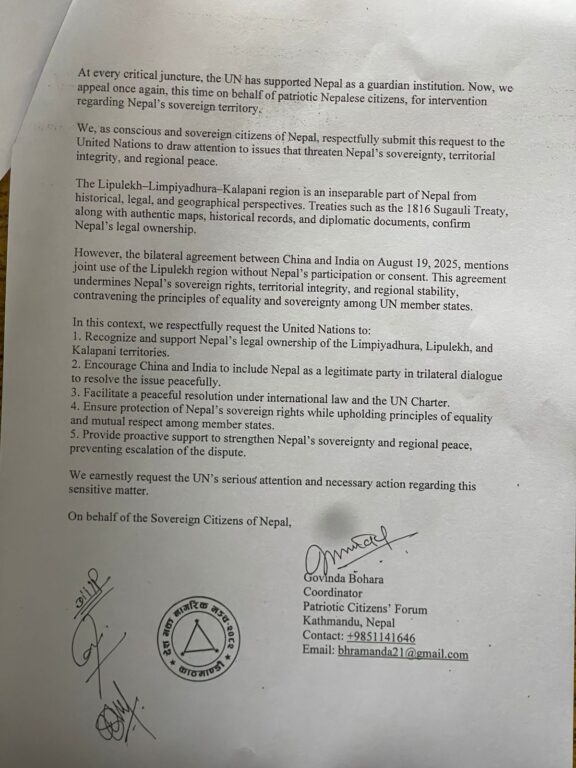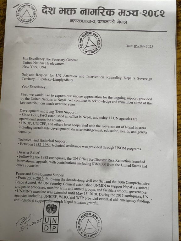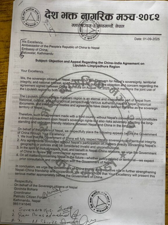 काठमाडौं, २० भदौ । देशभक्त नागरिक मञ्चले नेपालको सार्वभौम भूमि लिम्पियाधुरा, लिपुलेकमाथिको अतिक्रमणलाई रोक्नको लागि चिनियाँ दूतावास र संयुक्त राष्ट्रसंघलाई जनस्तरबाट बुझाईएको अपिलपत्र सार्वजनिक गरेको छ ।