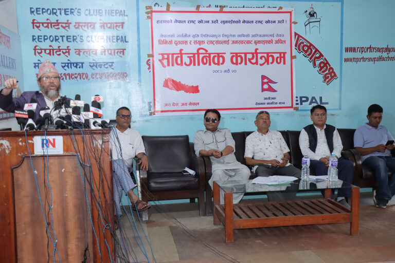 आज (आइतबार) रिपोर्टर्स क्लब नेपालमा पत्रकार सम्मेलन गर्दै मञ्चले आज हराएको नेपाल राष्ट्र खोज्न र लुकाईएको नेपाल राष्ट्र खोस्न उठ्नको लागि पनि अपिल गरेको छ । मञ्चले यस विषयमा पहिलोपटक चिनियाँ दूतावासमा नागरिकको सुझावसहित पत्र बुझाईएको जनाएको छ । मञ्चले चीनलाई नेपालको लिपुलेक, लिम्पियाधुरा र कालापानी नेपाली भूमि रहेको कुरालाई स्थापित गर्नको लागि सहयोग गर्न आग्रह गरेको छ ।