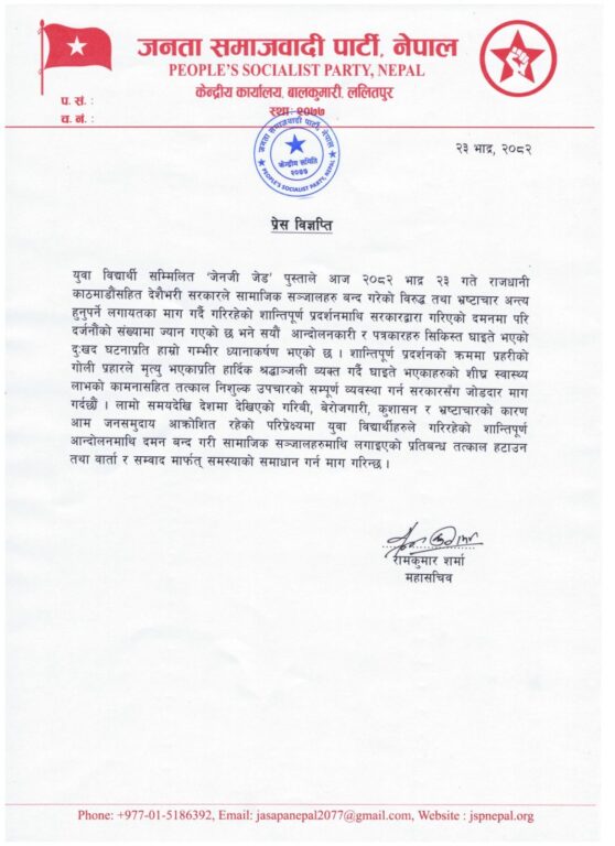 काठमाडौं, २३ भदौ । उपेन्द्र यादव नेतृत्वको जनता समाजवादी पार्टी, नेपालले जेन जी पुस्ताको आन्दोलनमा सरकारले दमन गरेको भन्दै गम्भीर ध्यानाकार्षण गराएको छ। जसपा नेपालका महासचिव रामकुमार शर्माले आज एक विज्ञप्ती जारी गर्दै जेन जी पुस्ताको आन्दोलनमा सरकारले दमन गरी दर्जनौं संख्यामा ज्यान गएको र सयौं आन्दोलनकारीहरु घाईते भएको भन्दै गम्भीर ध्यानकार्षण गराएका छन् ।