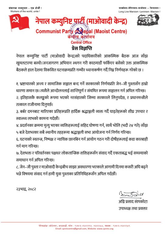 बैठकका निर्णय सार्वजनिक गर्दै माओवादी केन्द्रका उपाध्यक्षसमेत रहेका प्रवक्ता अग्निप्रसाद सापकोटाले जेन जी पुस्ताको मागप्रति माओवादीको धारणा समान रहेको स्पष्ट पारेका छन् ।