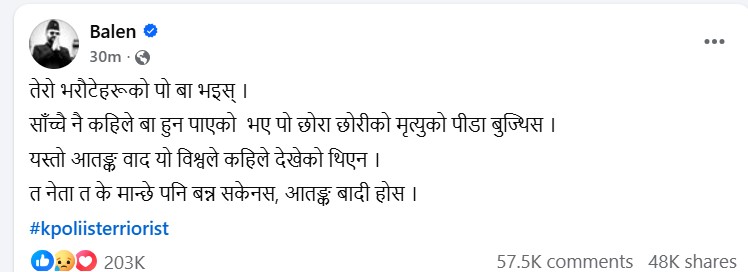 आज जेन-जी पुस्ताको आन्दोलनमा १९ जना नागरिकको ज्यान गएको घट्नाबारे बालेनले यस्तो टिप्पणी गरेका हुन् । उनले आजको जस्तो आतंकवाद विश्वले कहिल्यैपनि नदेखेको स्मरण गराएका छन् । उनले प्रधानमन्त्री ओलीलाई आतंकवादी भन्दै मान्छे बन्न नसकेको भनेका छन् ।