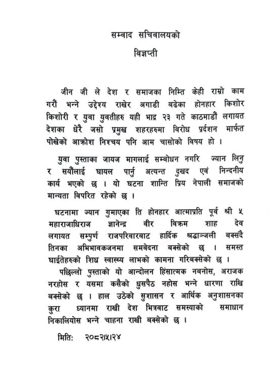 काठमाडौं, २४ भदौ । पूर्वराजा ज्ञानेन्द्र शाहको सम्वाद सचिवालयले युवा पुस्ताका जायज मागलाई सम्बोधन नगरी ज्यान लिनु र सयौंलाई घायल पार्नु अत्यन्त दुःखद् एवम निन्दनीय कार्य भएको भनेको छ । सम्वाद सचिवालयले आज एक विज्ञप्ती जारी गर्दै यो घट्ना शान्ति प्रिय नेपाली समाजको मान्यताविपरित रहेको भनेको छ ।