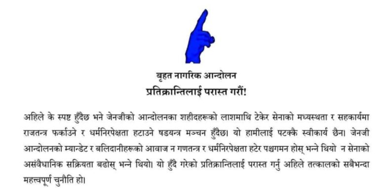 बृहत्त नागरिक आन्दोलनद्वारा बालेन शाहलाई कित्ता स्पष्ट गर्न सुझाव, नेपाली सेनाको भूमिकामाथि उठायो प्रश्न (विज्ञप्तीसहित)