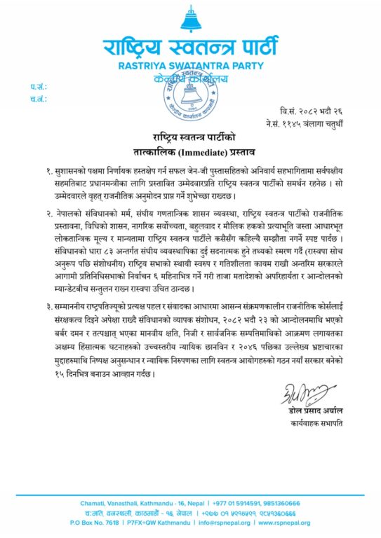 काठमाडौं, २६ भदौ । रवि लामिछाने नेतृत्वको रास्वपाको तात्कालिक प्रस्ताव सार्वजनिक भएको छ । रास्वपाको तर्फबाट कार्यवाहक सभापति डोल प्रसाद अर्यालले आज साँझ विज्ञप्ती जारी गर्दै सुशासनको पक्षमा निर्णायक हस्तक्षेप गर्न सफल जेन-जी पुस्तासहितको अनिवार्य सहभागितामा सर्वपक्षीय सहमतिबाट प्रधानमन्त्रीका लागि प्रस्तावित उम्मेद्वारप्रति रास्वपाको समर्थन रहने जनाईएको छ ।