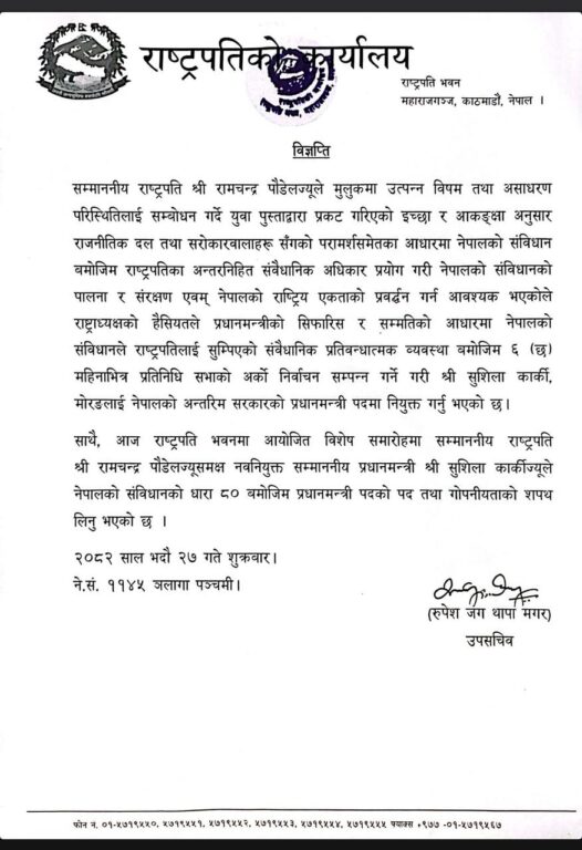 नवनियुक्त प्रधानमन्त्री कार्कीको शपथग्रहण समेत सम्पन्न भैसकेको छ । कार्की नेतृत्वको नयाँ सरकारले आगामी फागुनभित्रै संसद्को निर्वाचन गराउनुपर्नेछ ।