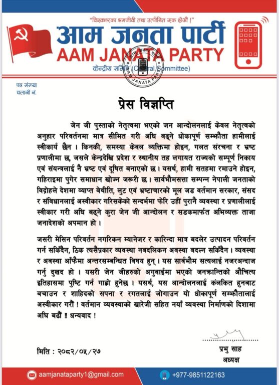 काठमाडौं । आम जनता पार्टी (आजपा)का अध्यक्ष प्रभु साहले पुरानै व्यवस्था र प्रणालीलाई स्वीकार गरी केवल सरकारमात्रै परिवर्तन हुनु जेन-जी आन्दोलन र सडकमार्फत अभिव्यक्त ताजा जनादेशको अपमान भएको जनाएका छन् ।