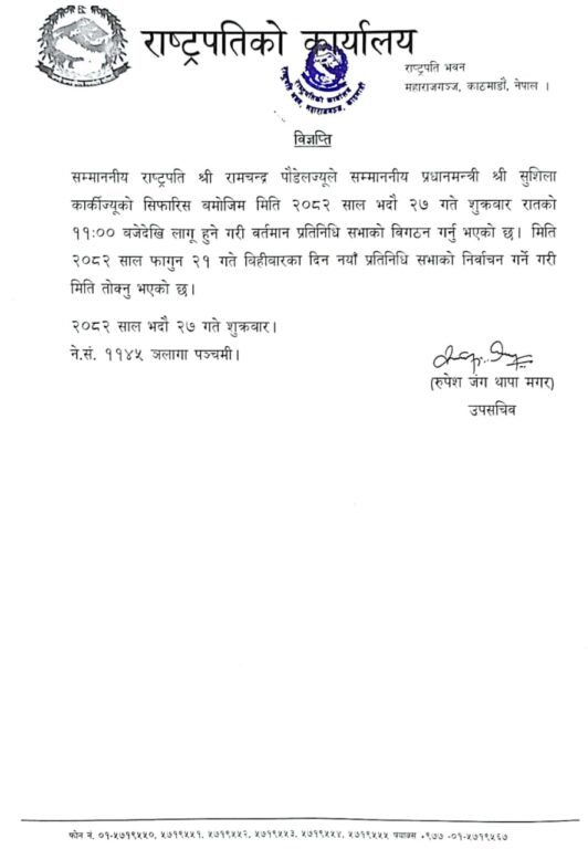 काठमाडौं, २८ भदौ । राष्ट्रपति रामचन्द्र पौडेलले नवनियुक्त प्रधानमन्त्री सुशीला कार्कीको सिफारिसमा प्रतिनिधिसभा विघटनको निर्णय गरेका छन् ।