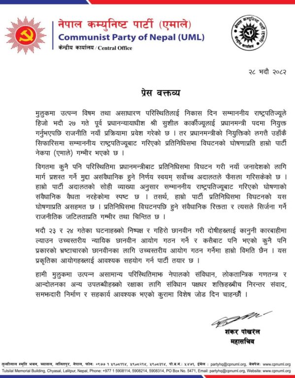 विज्ञप्तीमा भनिएको छ,विगतमा कुनै पनि परिस्थितिमा प्रधानमन्त्रीबाट प्रतिनिधिसभा विघटन गरी नयाँ जनादेशको लागि मार्ग प्रशस्त गर्ने मुद्दा असंवैधानिक हुने निर्णय स्वयम् सर्वोच्च अदालतले फैसला गरिसकेको छ, हाम्रो पार्टी अदालतको सोही व्याख्या अनुसार सम्माननीय राष्ट्रपतिज्यूबाट गरिएको घोषणाको संवैधानिक वैधता नरहेकोमा स्पष्ट छ। तसर्थ, हाम्रो पार्टी प्रतिनिधिसभा विघटनको यस घोषणाप्रति असहमत छ। प्रतिनिधिसभा विघटनपछि हुने संवैधानिक रिक्तता र त्यसले सिर्जना गर्ने राजनीतिक जटिलताप्रति गम्भीर तथा चिन्तित छ।’