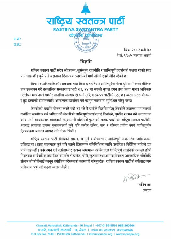 काठमाडौं, ३० भदौ । रवि लामिछाने नेतृत्वको राष्ट्रिय स्वतन्त्र पार्टीले जेन–जीको आन्दोलनमा भएको आततायी दमन र क्रुर हत्याको दोषीहरुमाथि आवश्यक छानबिन गरी कानूनी कारबाही सुनिश्चित् गरिनुपर्ने माग गरेको छ । रास्वपाका प्रवक्ता मनिष झाले आज एक विज्ञप्ती जारी गर्दै यस्तो माग गरेका हुन् । उनले रास्वपा सदैव लोकतन्त्र, सुसंस्कृत र शान्तिपूर्ण प्रदर्शनको पक्षमा रहेको स्पष्ट पारेको छ । झाले आफ्नो दलको कुनैपनि बहानामा हिंसात्मक प्रदर्शनको मार्ग नलिने नीति रहेको पनि सुनाए ।